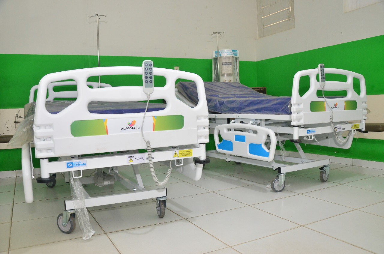 O prefeito de Major Izidoro, Theobaldo Cintra, ao lado da diretora do Hospital Ezechias da Rocha, Maria do Carmo e do secretário municipal de Saúde, Alessandro Costa, receberam nessa quinta-feira (28), 20 camas hospitalares novas do tipo Elétrica e dez novos aparelhos de ar condicionados em parceria com o governo do Estado.