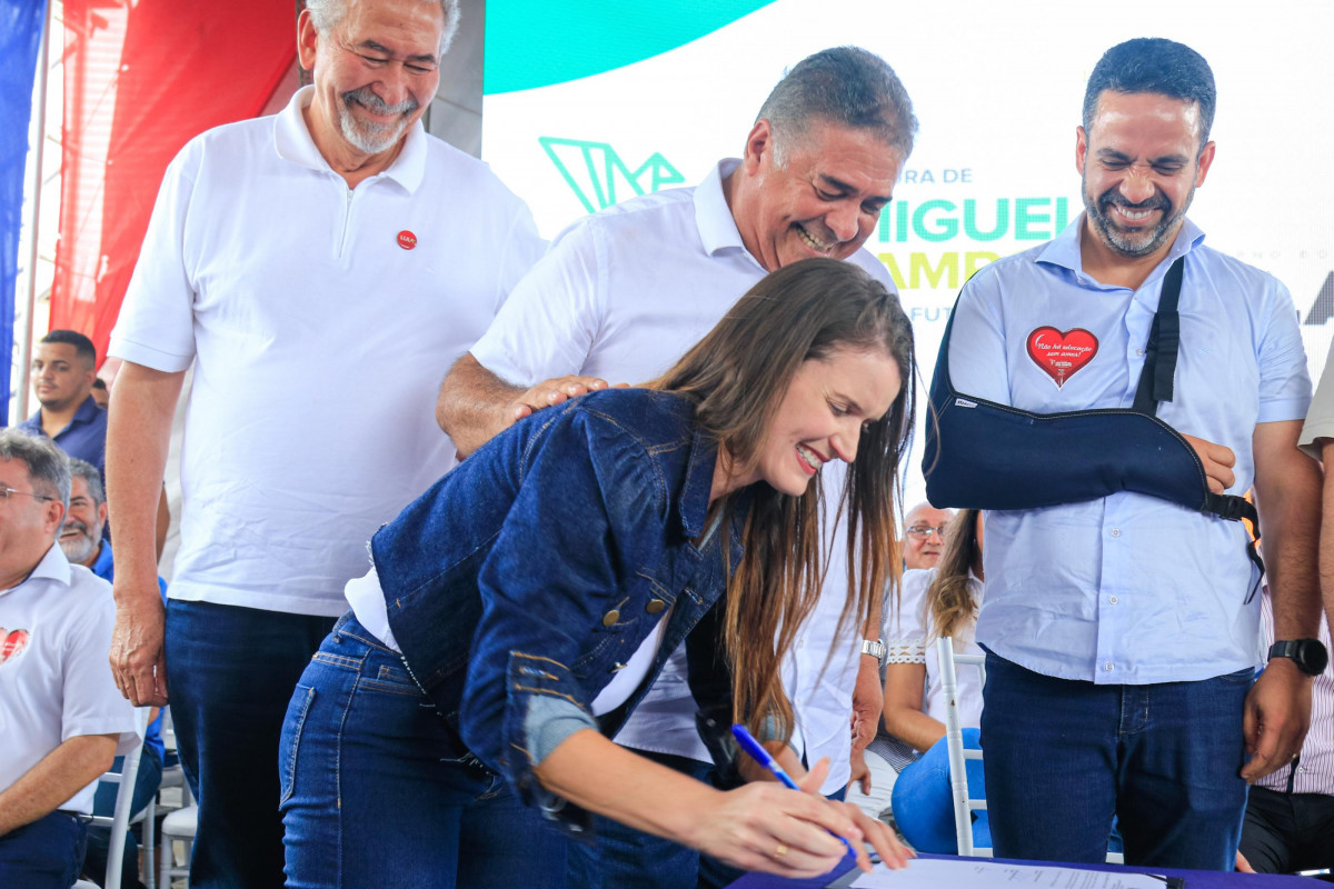 O governador Paulo Dantas, o prefeito de São Miguel dos Campos, George Clemente, e a secretária de Estado da Infraestrutura, Maria Gevan, assinaram convênio, neste domingo (26), para obras de pavimentação, esgotamento sanitário e rede de abastecimento no Conjunto Habitacional Hélio Jatobá I, II e III. Serão investidos R$ 154 milhões do tesouro estadual, que vão beneficiar 25 mil moradores.