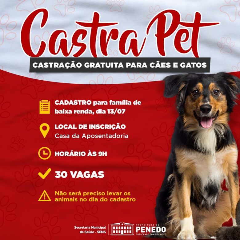 A Secretaria Municipal de Saúde (SEMS) realiza nesta quarta-feira, 13 de julho, o cadastro de mais uma edição do Castrapet, programa que castra cães e gatos de forma gratuita para famílias de baixa renda de Penedo.