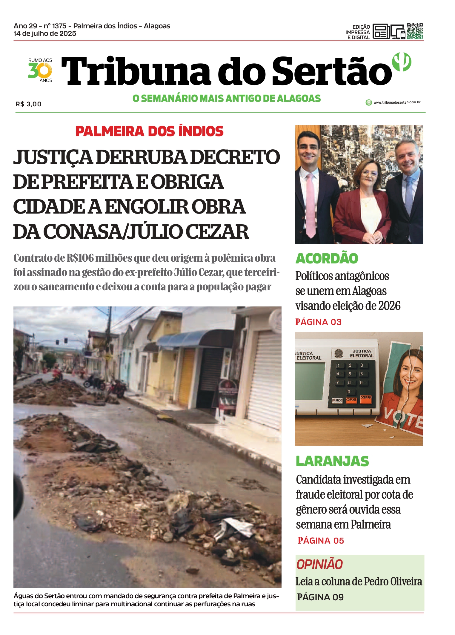 A edição impressa da Tribuna do Sertão desta segunda-feira, 14 de julho de 2025, traz manchetes explosivas que prometem agitar o cenário político e jurídico de Alagoas.