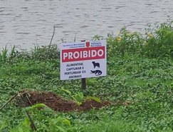 As placas orientam os frequentadores do lago quanto às práticas que devem ser evitadas para não comprometer o habitat desses animais, reforçando o papel da educação ambiental na proteção da fauna local.