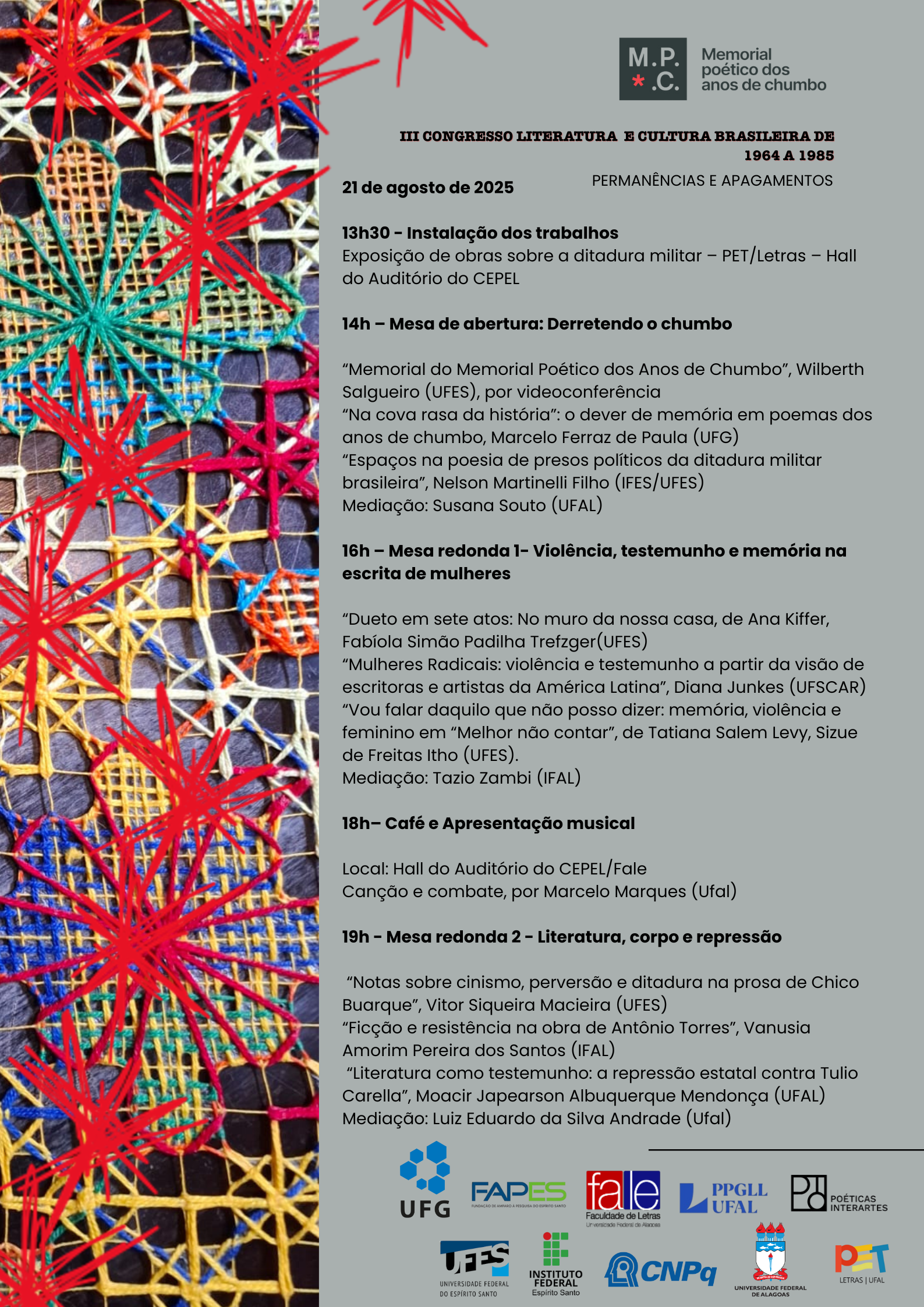 No evento da Ufal o debate transcorre com análise de obras literárias e as influências do período no teatro e no cinema. O PE/Letras fará uma exposição de obras sobre a ditadura e ao final do congresso haverá um espaço para lançamento de livros.