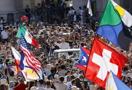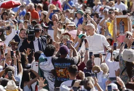 Leão XIV recebe caixa de pizza durante passeio de papamóvel
